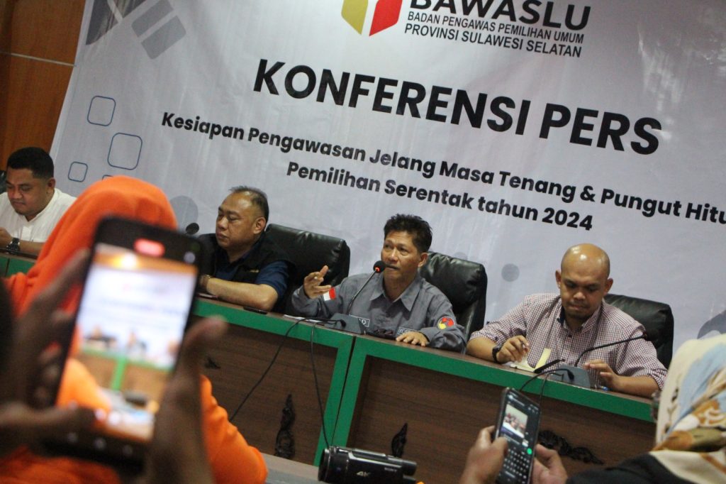 Keterangan Gambar: Anggota Bawaslu Sulsel Saiful Jihad dan Andarias Duma saat melakukan konferensi pers dengan awak media di Sekretariat Bawaslu Sulsel, Jumat (22/11/2024).