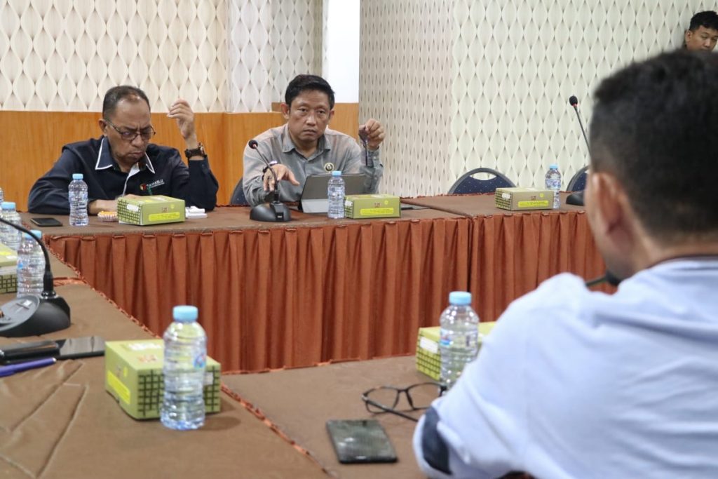 Keterangan Gambar: Ketua Bawaslu Sulsel HL Arumahi dan Anggota Bawaslu Azry Yusuf melakukan rapat koordinasi dengan Ketua dan Anggota KPU Sulsel terkait tahapan verifikasi faktual kepengurusan parpol calon peserta pemilu, di Kantor KPU Sulsel, Jumat (14/10).