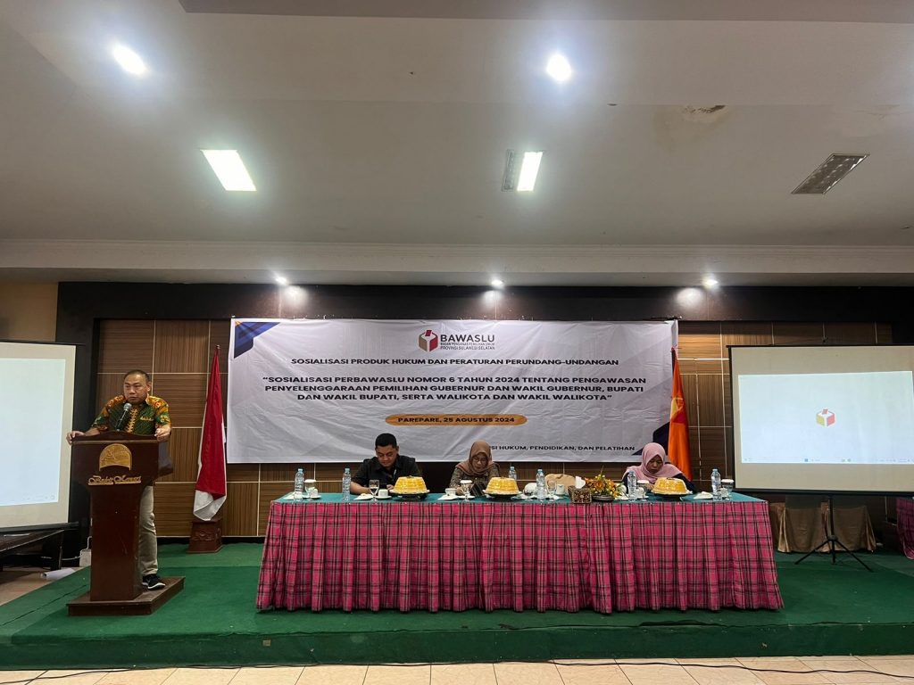 Parepare, Badan Pengawas Pemilihan Umum - Badan Pengawas Pemilihan Umum (Bawaslu) Provinsi Sulawesi Selatan mengadakan sosialisasi terkait Peraturan Bawaslu (Perbawaslu) No. 6 Tahun 2024 tentang Pengawasan Penyelenggaraan Pemilihan Gubernur dan Wakil Gubernur, Bupati dan Wakil Bupati, serta Walikota dan Wakil Walikota. Kegiatan ini berlangsung di Hotel Kenari, Parepare, dan dihadiri oleh Koordinator Divisi Hukum beserta staf dari 24 Kabupaten/Kota se-Sulawesi Selatan, Minggu (25/8).