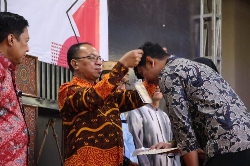 Keterangan Gambar: Ketua Bawaslu Sulsel HL Arumahi mengalungkan kartu tanda peserta peresmian dibukanya kegiatan sosialisasi pengawasan partisipatif gerakan sadar demokrasi.