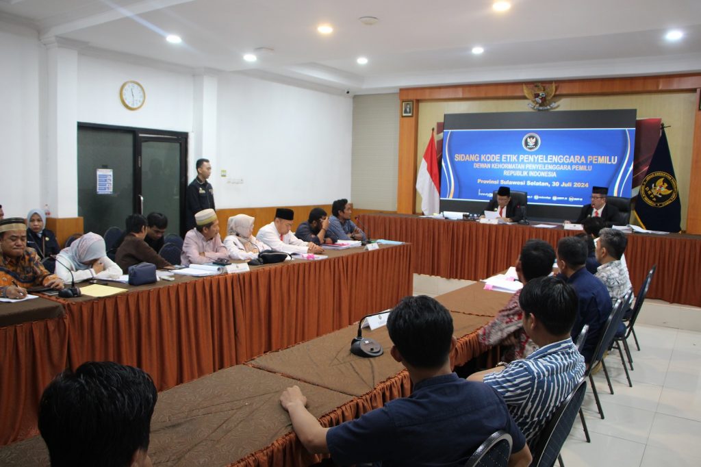 Makassar, Badan Pengawas Pemilihan Umum - Ketua dan Anggota Bawaslu Sulsel memberikan keterangan sebagai pihak terkait pada sidang pemeriksaan dugaan pelanggaran Kode Etik Penyelenggara Pemilu (KEPP) perkara nomor 107-PKE-DKPP/V/2024 yang digelar Dewan Kehormatan Penyelenggara Pemilu (DKPP) di Kantor KPU Provinsi Sulawesi Selatan, Kota Makasar, Selasa (30/7/2024) pukul 10.00 WITA.