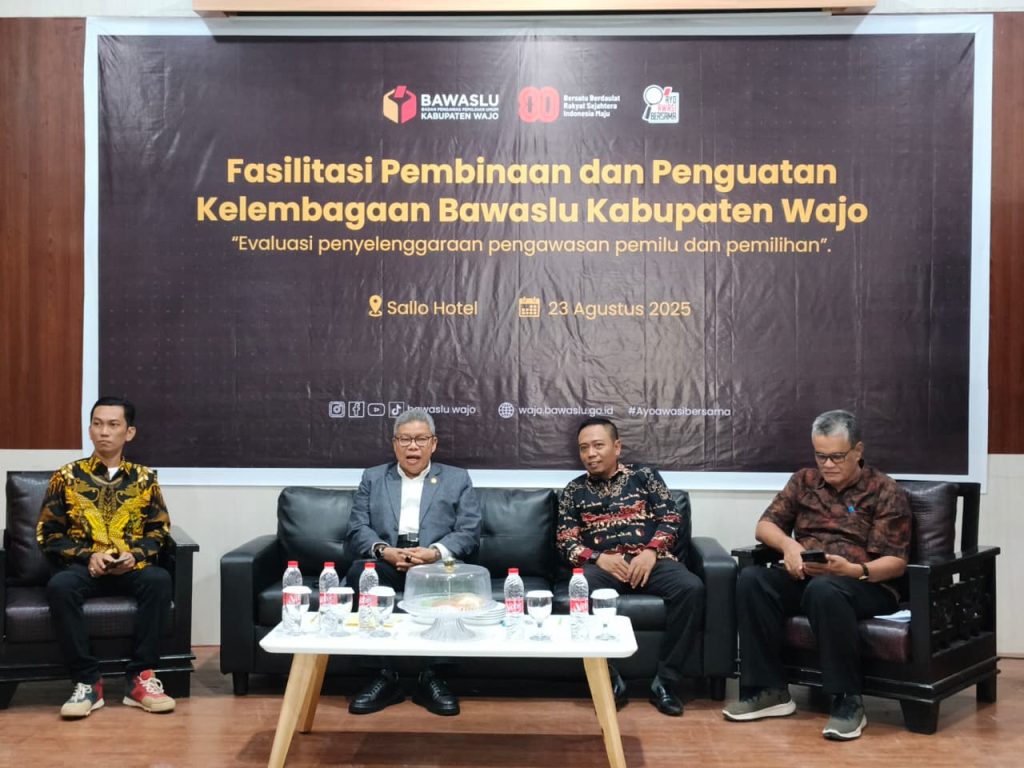 Wajo, Badan Pengawas Pemilihan Umum - Badan Pengawas Pemilihan Umum (Bawaslu) Kabupaten Wajo menggelar kegiatan Fasilitasi Pembinaan dan Penguatan Kelembagaan dengan tema “Evaluasi Penyelenggaraan Pemilu dan Pemilihan†di Sallo Hotel Sengkang, Sabtu (23/8).