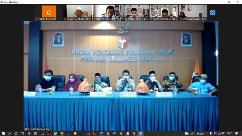 Kegiatan ini berlangsung terbatas di ruang sidang Nur Muthmainnah Bawaslu Sulsel dengan memperhatikan protokol kesehatan dan dihadiri secara daring juga oleh Anggota Bawaslu Kabupaten/Kota.