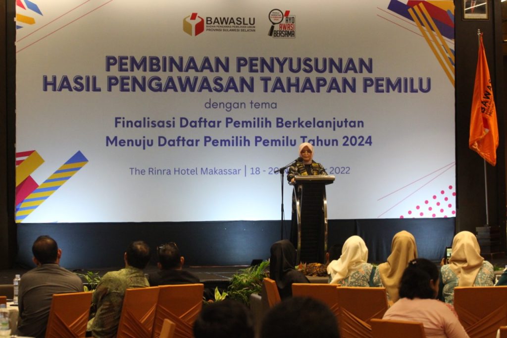Keterangan Gambar: Anggota Bawaslu Lolly Suhenty saat memberikan arahan pada Fasilitasi Pembinaan Penyusunan Hasil Pengawasan Tahapan Pemilu, di Makassar, Jumat (18/11/2022)