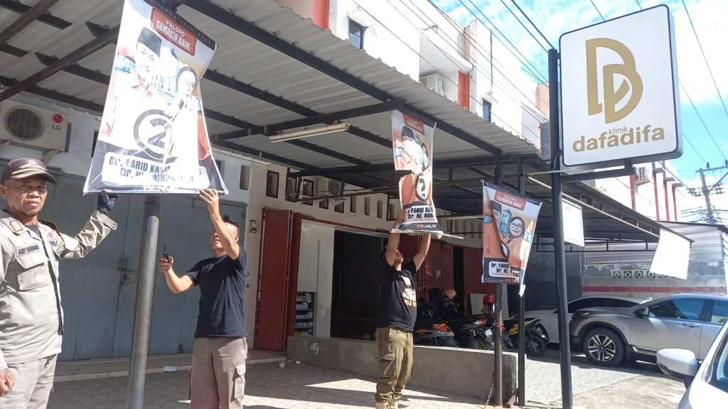 Keterangan Gambar: Tim gabungan dari Dinas Lingkungan Hidup (DLH), Satuan Polisi Pamong Praja (Satpol PP), serta seluruh jajaran pengawas pemilu dari tingkat kota hingga Tempat Pemungutan Suara (TPS) saat penertiban APK, Rabu (21/5/2025).