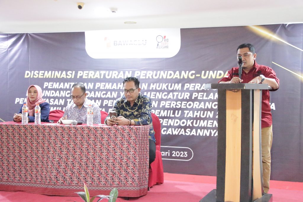 Makassar, Badan Pengawas Pemilihan Umum- Kegiatan Disemisnasi Peraturan Perundang-undangan dilaksanakan di Hotel Swiss-belinn Panakkukang Makassar pada tanggal 26 s.d 27 Februari 2023 dengan tema “Pemantapan Pemahaman Hukum Peraturan Perundang-undangan yang mengatur Pelaksanaan Pengawasan Tahapan Pencalonan Perseorangan Peserta Pemilu Anggota DPD Pada Pemilu Tahun 2024 dan Relasi Hukumnya dengan Pendokumentasian Hukum Hasil Pengawasan†yang dihadiri oleh Kordiv Hukum dan Staf Hukum Kabupaten/Kota Provinsi Sulawesi Selatan.