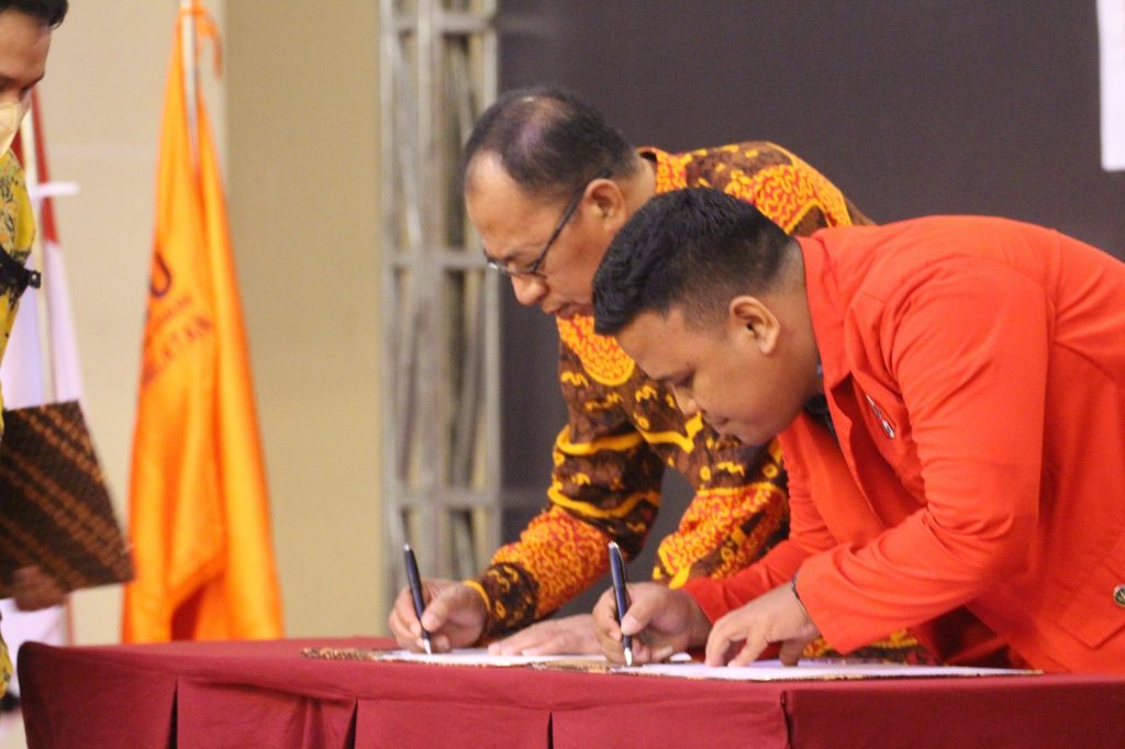 Keterangan Gambar: Ketua Bawaslu Sulsel HL Arumahi berfoto bersama usai penandatangan MoU dengan GMNI Sulawesi Selatan, Jumat (23/9/2022)